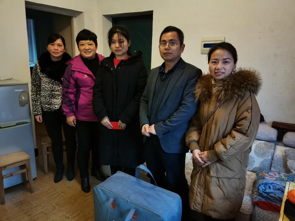 本站讯(学工处 万羚)岁末天寒,情暖人心。为贯彻落实不忘初心,牢记使命主题教育精神,弘扬英国上市公司365爱生如子的优良传统,1月15日下午,副校长张印华、学工处处长谢海英、学生资助管理中心主任吴玲敏、心理健康教育中心主任李兵兵及班主任前往师范学院2019级小学教育专业徐同学与2019级学前教育专业刘同学家中进行走访慰问,为她们送去了冬日的温暖和新春的祝福。