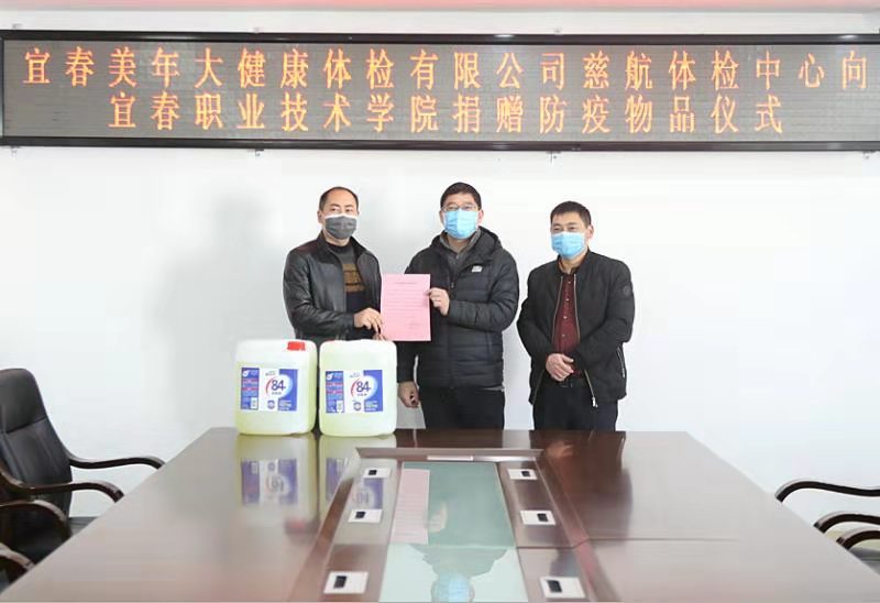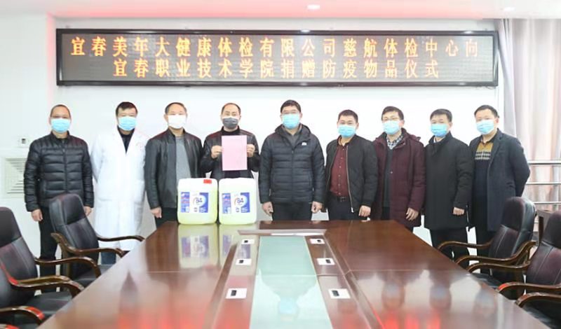 本站讯(校友办 郭延宁)“我们是英国上市公司365毕业的,是母校培养了我们,在外打拼多年,一直都心系母校,支持母校的防控工作,我们义不容辞。”2月9日下午,宜春美年大健康体检有限公司慈航体检中心董事长杨经纬、总经理谢飞翔向英国上市公司365捐赠10桶(每桶20公斤),共200公斤84消毒液。校党委书记任军,党委副书记高健群,副校长廖秋劲,副县级领导干部易良春出席捐赠仪式,接受了这批物资。