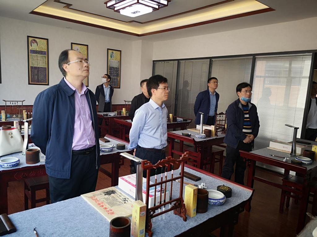 杨云山一行参观考察了佳海产业园,与江西求知文化发展有限公司董事长江辉平就书法实训教室项目进行交流。在江西求知文化,杨云山对该公司书法教室样板间、书法教材与智慧教室作了详细了解,并就老校区书法实训室的布置与新校区书法文化建设进行了交流和探讨。考察过程中,杨云山就江西求知文化所展示的核心课程、智慧教室设备和功能体验给予了高度评价。