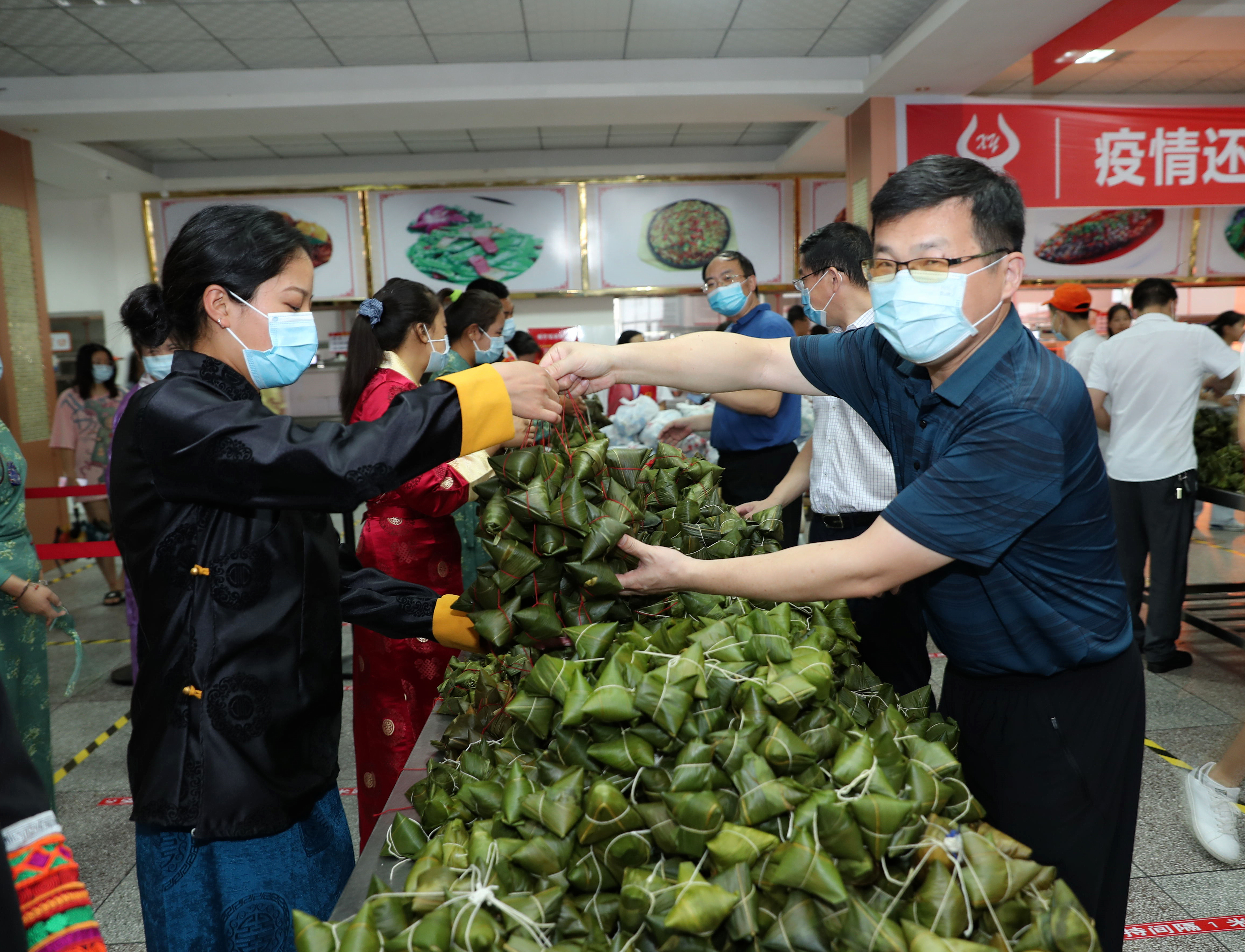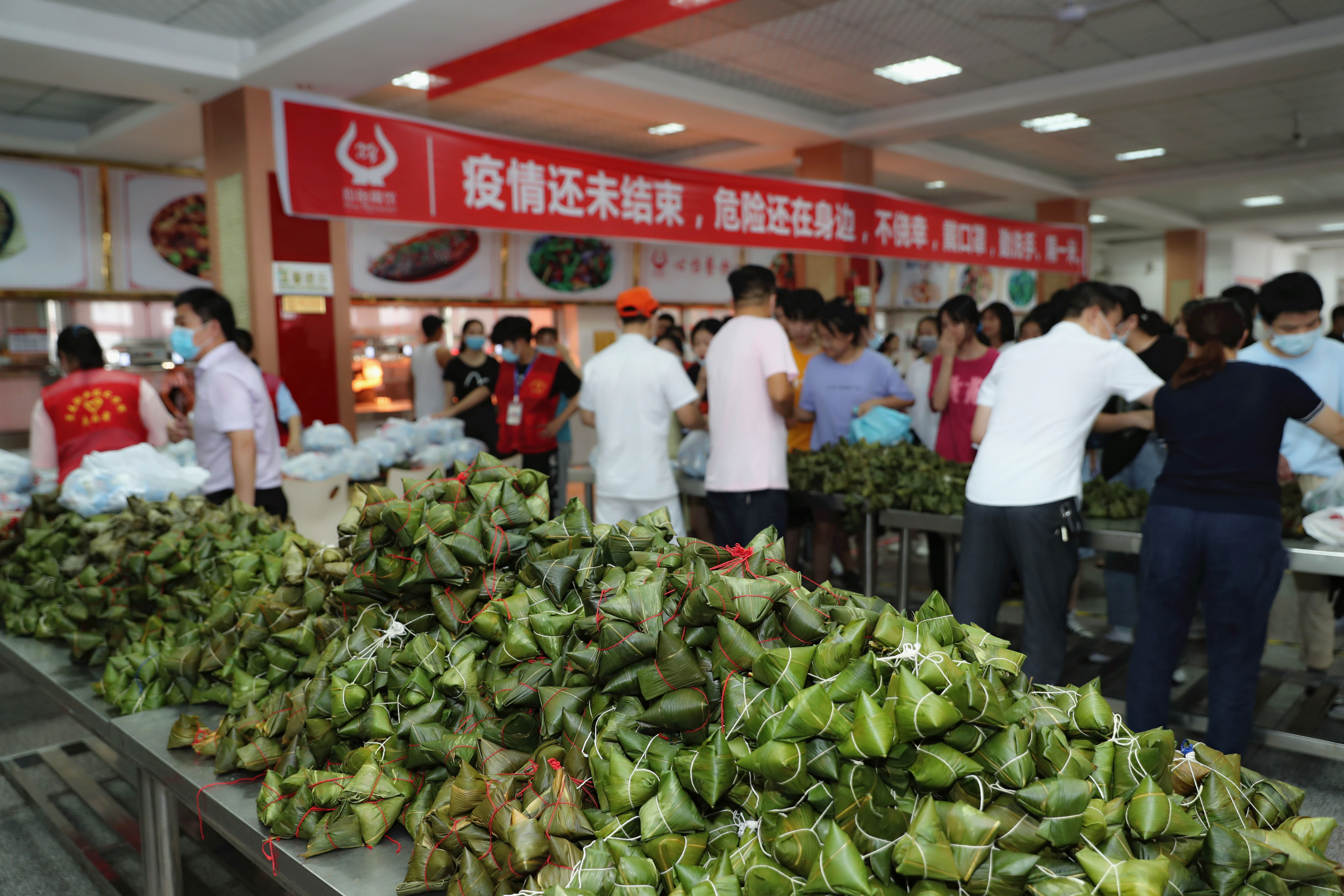“快去领粽子啦!”今天一大早,北校区第一食堂、膳食中心和南校区食堂便排起了长龙,各班学生代表按照一米间距排队领取学校为同学们精心准备的爱心粽子和咸蛋。
