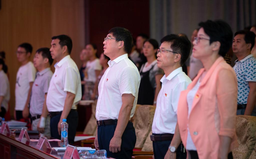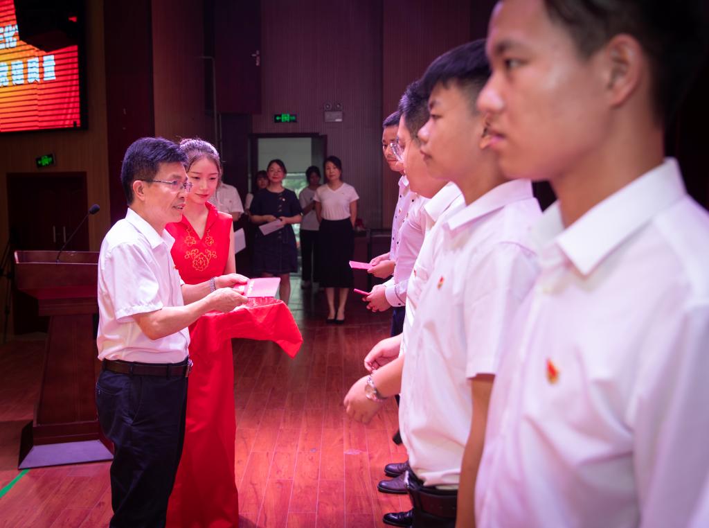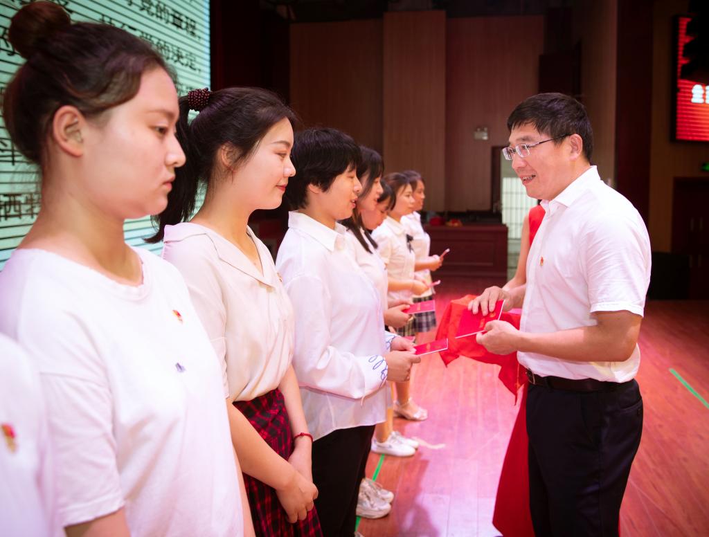 会议在庄严的国歌声中拉开帷幕。机关党委专职副书记敖美蓉带领新党员面向鲜红党旗庄严宣誓。校领导为新党员赠送党章。
