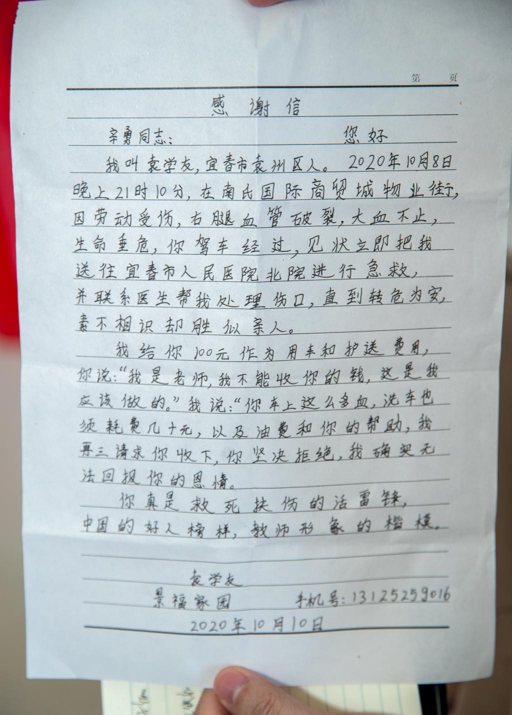 见到帮助自己的好心人,母子俩十分激动,不停地道谢。据回忆,当时男子袁学友在劳动过程中受伤后,血流不止,情况危急,须尽快前往救治。由于地处偏僻,车辆较少,且前几次拦车无果,母子二人非常着急。此刻辛咏老师恰好驾车经过,在短暂询问后,辛咏老师果断送其前往医院救治,由于出血量大,辛咏老师车上多处蹭到血迹,但他却丝毫没有在意。同时考虑到伤情较重,辛咏老师主动提出去条件较好的宜春人民医院北院,并积极联系医生处理伤口。在家属以用车和护送费用为名支付钱财表示感谢时,辛老师坚决拒绝:“我是老师,这是我应该做的,我不能收你的钱!”
