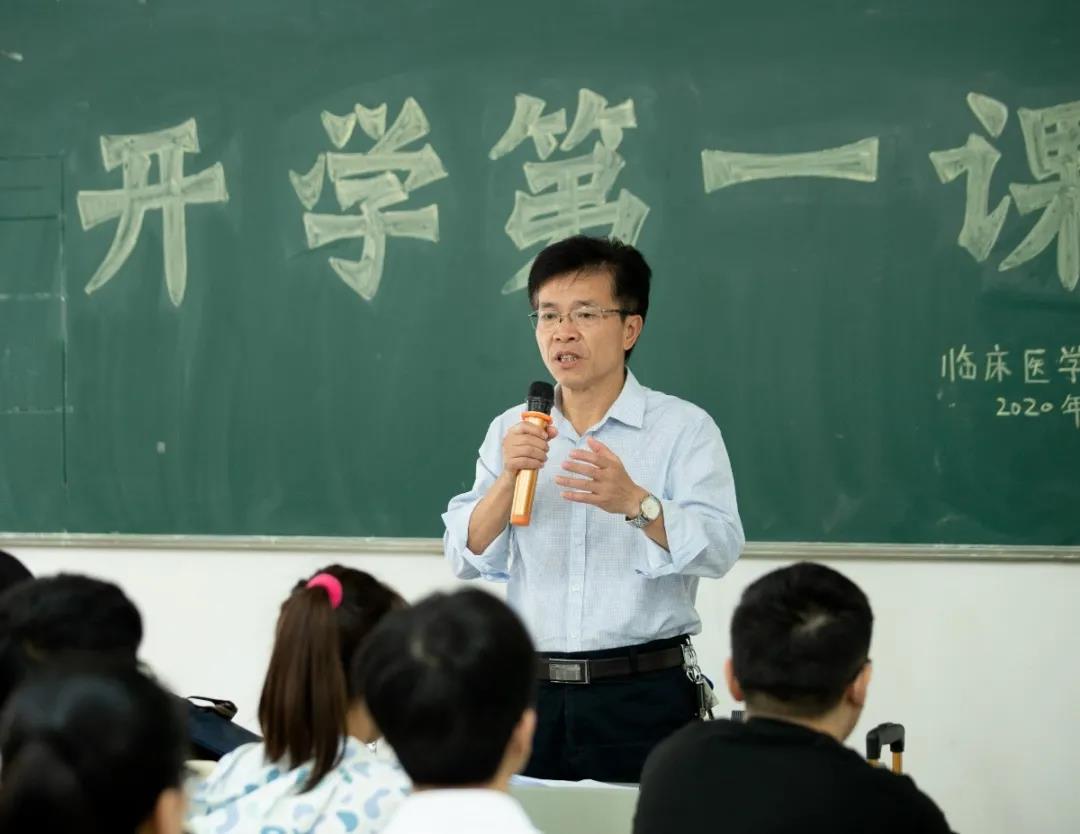 校党委副书记、校长杨云山给20级临床医学1班带来了“开学第一课”,杨校长亲切询问同学们的家乡和学习生活的基本情况,拉近了彼此间距离。他以最新数据对比了中美两国疫情现状和抗疫举措,带领同学们深刻认识了中国特色社会主义的制度优势与治理优势,由此坚定对中国智慧和中国方案的信心。