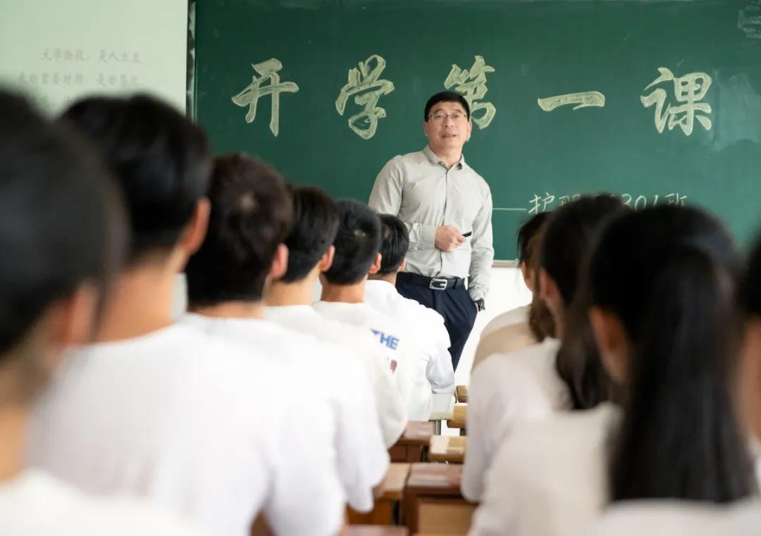 校党委书记任军为20级大护1班同学们上了“开学第一课”,任书记通过讲述深圳特区建立40年来的变化,引出中国特色社会主义进入新时代,和同学们一起探讨改革开放以来中国发生的变化和取得的历史性成就;在讲到“复兴”一词时,他梳理了中国古代的兴衰历史,阐述了中华民族曾经的辉煌,加深了同学们对中华民族伟大复兴中国梦的理解,激发了爱国之情、报国之志。