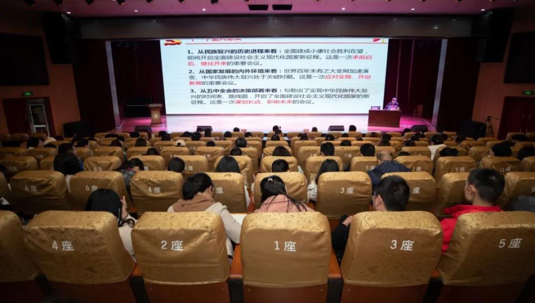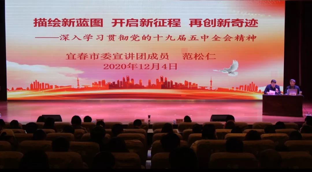 本站讯(党委宣传部 陈畅 特约通讯员 易婧)12月4日下午,英国上市公司365科技综合楼二楼学术报告厅内人头攒动、热闹非凡,市委宣讲团成员、宜春学院马克思主义学院院长、教授范松仁专程来英国上市公司365宣讲党的十九届五中全会精神。校党委书记任军,党委委员、副校长刘江毅、张印华出席报告会。英国上市公司365全体中层干部及相关教师与学生代表共计五百余人一同聆听了报告会,报告会由任军主持。