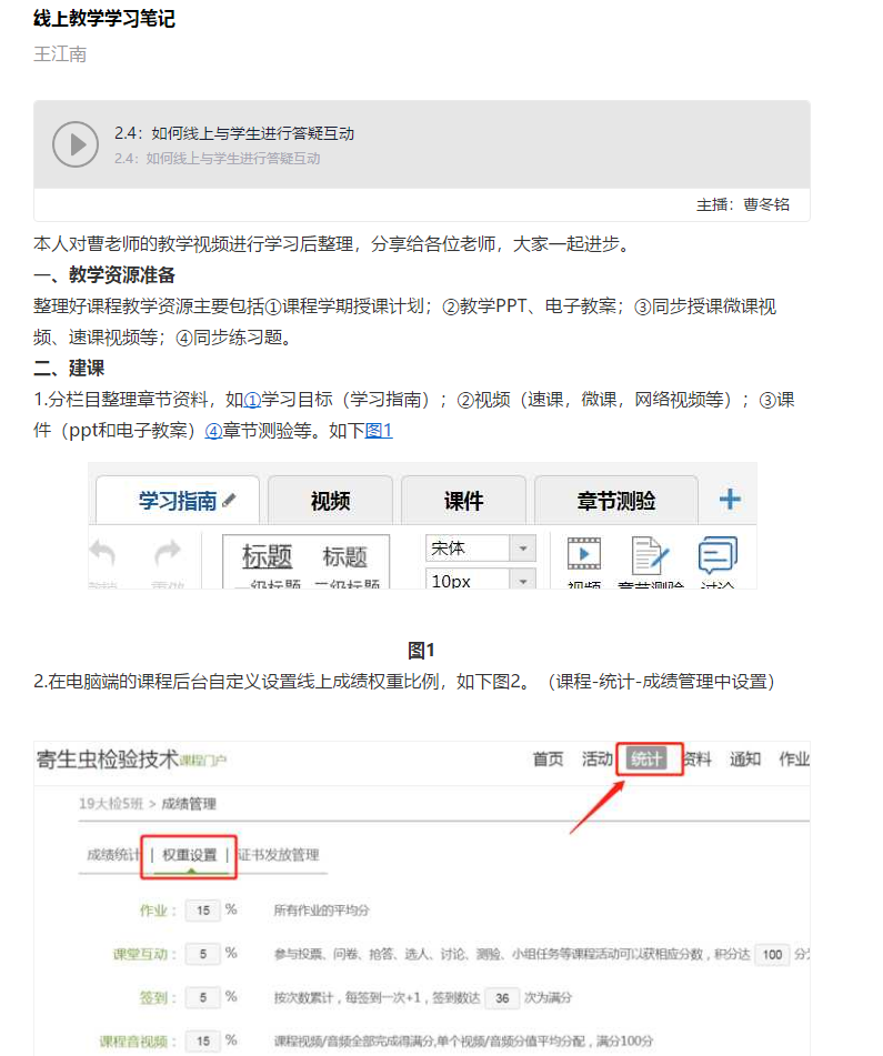 承担网络授课任务的教师精心备课,精心制做线上教学专用PPT,参考其它高校同学科(专业)网课视频,丰富教学内容;开课前提前对接任课班级班长,组建微信群、QQ群、钉钉群等即时沟通平台,及时分享教学课件,确保开课就能上课,力争达到实体课堂的教学效果;科学制定每周学习任务清单,建立线上学习成果汇报机制、监督评价机制,保证学生学习效果。