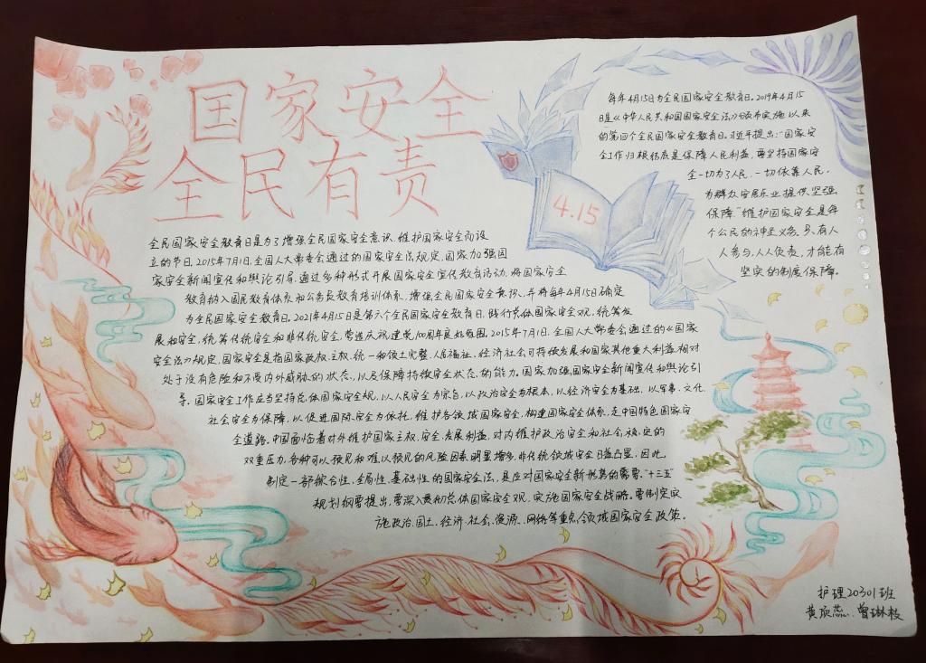 本次比赛面向护理学院全体在校学生,同学们积极参加,搜集了大量素材,充分发挥自己的想象力,精心设计版面、绘制报头、选择内容,阐释了自己对“国家安全”的认识,同学们在锻炼动手、写作、创新等综合能力的同时,激发了学习国家安全观的热情。本次比赛共征集了80副作品,部分作品在南校区天使广场张贴展出,巧妙的构图、巧妙的排版、巧妙的绘画技巧……一幅幅巧妙的精美绝伦的手抄报引得许多过往同学驻足观赏和讨论,是为南校区一道靓丽的风景。最后,经评委老师综合评审,共评出了10副获奖作品,其中护理20302班张默、护理20301班黄项蕊和护理20301班曾琳枝的作品获的了一等奖。