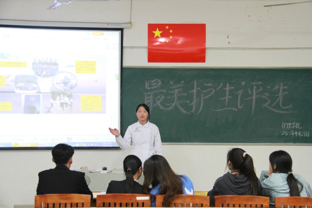 本站讯(护理学院 汤琼 学生记者 张美玲)为迎接“5·12”国际护士节,培养大学生争先创优的先进意识。4月28日下午五点半,护理学院在四教学楼411教室开展2021年“最美护士生”评选比赛,团总支负责人刘小三、辅导员汤琼担当评委。
