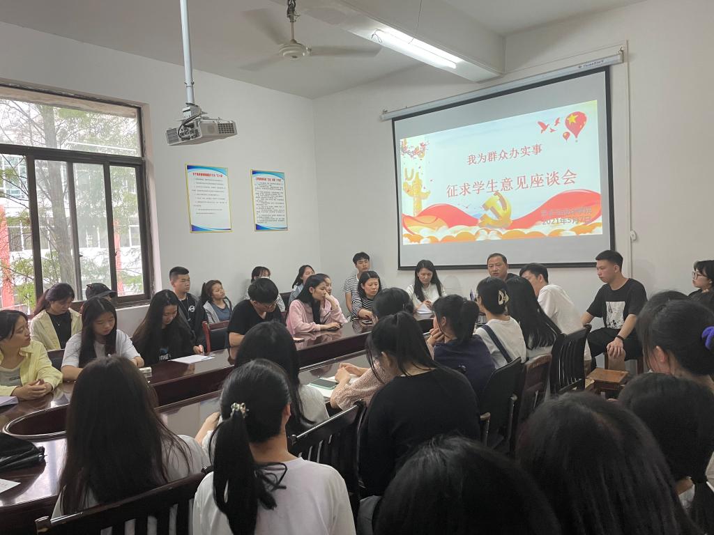 本站迅(艺术与设计学院 学生记者 雷北婷)为深入了解和倾听大家的呼声和诉求,听取各班级意见和建议,以实际行动为群众办实事,艺术与设计学院于2021年5月7日下午3:40在科技楼三楼会议室开展“我为群众办实事,征求学生意见座谈会”,出席本次座谈会的有党总支书记罗平、学工科科长郑立波、教务科科长熊雪舟、美术教研室曹斐老师。