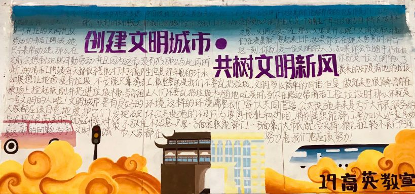 各班级经过几周的精心准备,每一幅板报都主题突出,内容丰富,设计新颖,布局合理,色彩搭配明亮和谐。从文章选取到美术设计,从绘画涂色到剪贴排版,全都体现了大家对此次板报比赛的重视。设计美观、形式多样的板报,表达了同学们对创建文明城市能够取得更大进步的美好愿望。经过评比,英语教育18503班荣获此次活动的一等奖。