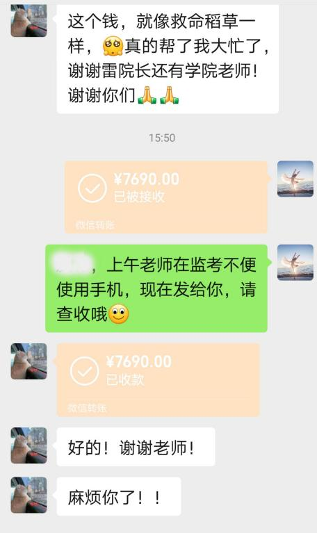 得知张同学的困难处境,师范学院院长雷水龙带头先捐出2000元,立即安排她住院治疗。院领导高度重视,共商帮扶方案,师范学院党总支书记邹晓英立即向全院党员教师发起爱心捐助倡议,党员老师们了解到张同学的困难后,纷纷奉献出爱心,截止发稿,共募集爱心款9790元(含班主任捐款100元)。加上为她申请的“99助学”款1500元,两笔爱心款已全数送到张同学手上。目前,张同学在积极配合治疗,病情向好。对师范学院领导、党员老师们给予的关心帮助,张同学十分感动,执意要尽快当面感谢雷院长和各位老师。她通过微信转告老师们:“我何德何能,让老师们这么帮助我!”“真的太感谢师范学院的老师们了!让我这个远从云南来的学生感到家的温暖!真的太感激你们了!”