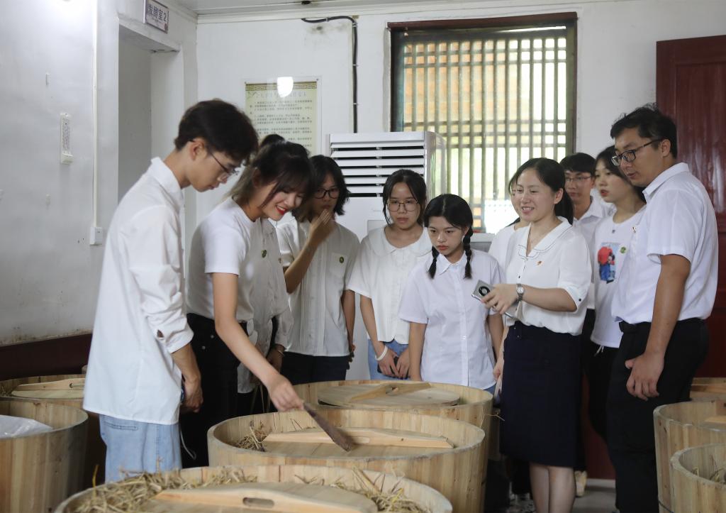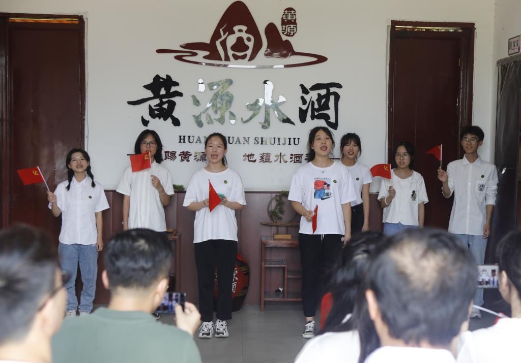 随后,刘永书记带领全体师生来到了黄源水酒生产基地参观。据刘书记介绍,村里设立了专门的扶贫岗位,为激发贫困户的内生动力,还出台了为每个贫因户免费发放鹅苗、南瓜种植等一系列奖励政策。在生产基地大厅里,大家看到在“水酒书记”的带领下黄源水酒项目获得的一系列荣誉,如第四届“中国创翼”创业创新大赛全国总决赛三等奖、江西省创业创新大赛一等奖等。参观过后,同学们带来了诗朗诵《心愿》、情景剧《支月英》、歌曲《唱支山歌给党听》等节目,以此感恩在党的正确领导下不断在乡村振兴道路上发光发热、无私奉献的党员干部和人民群众。