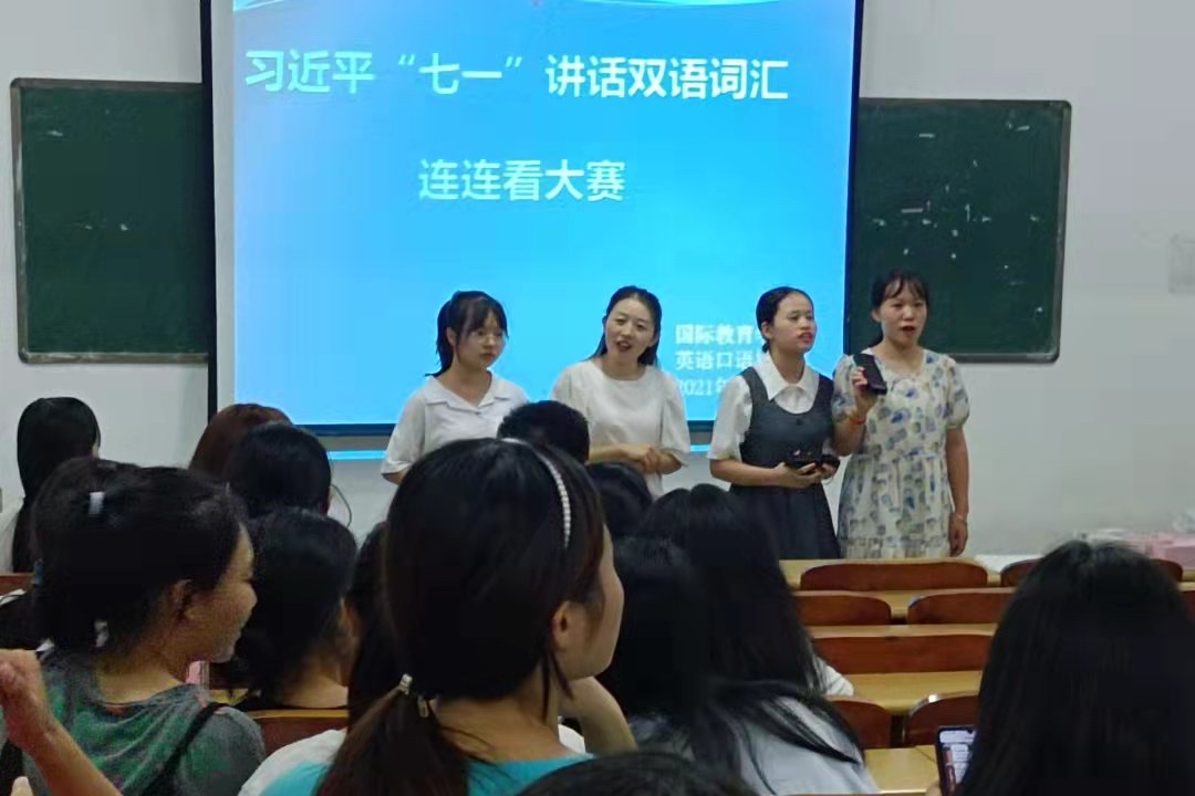 本站讯(国际教育学院 徐卫红 学生记者 李雅珍)在建党百年之际,为引导我院学生深入领会习近平“七一”重要讲话精神,切实增强学生的历史责任感和使命感,激发青年学生爱国爱党爱社会主义的热情,国际教育学院创新学习形式,于9月24日晚在实训楼409举行习近平“七一”讲话双语词汇连连看大赛。本次比赛由英语口语协会承办,英语口语协会指导老师徐卫红到比赛现场进行指导。