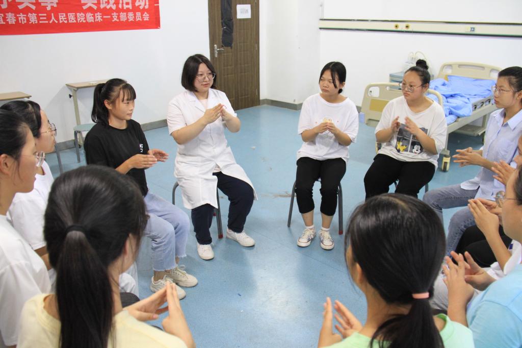活动伊始,王医生向在场的同学做了自我介绍,讲述了此次活动的意义,并采用座谈交流及游戏互动的方式了解学生的心理。在活动中王医生召集学生围坐在一起,让学生将双手伸出,手指一根两根依次相互叩击。叩击完毕后王医生问道:“同学们有什么样的感觉?”随后有同学站起回答说:“感觉心很平静!”稍后的游戏互动环节中王医生让六位同学随机抽取了提前准备好的便签,同学们按照便签上的提示进行了相应动作展示。游戏过程中同学们表现积极,共同解决问题,体验到了心理游戏带来的喜悦和自信,同时也激发、调整同学们的心理、敢于应对挑战、使心态开放稳定。