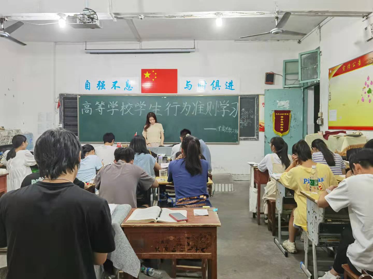 各班辅导员首先提出“1.志存高远,坚定信念;2.热爱祖国,服务人民;3.勤奋学习,自强不息;4.遵纪守法,弘扬正气;5.诚实守信,严于律己;6.明礼修身,团结友爱;7.勤俭节约,艰苦奋斗;8.强健体魄,热爱生活”八条高校学生标准行为准则,并对准则条例一一做出解析与举例,且随机挑选同学为其中个例表达自己的看法并提出更好约束自我遵守规范的可行建议。随后,辅导员为同学发言内容进行指正,和对可行建议的优化,给予同学们科学,有效的准则理解与规范方式。