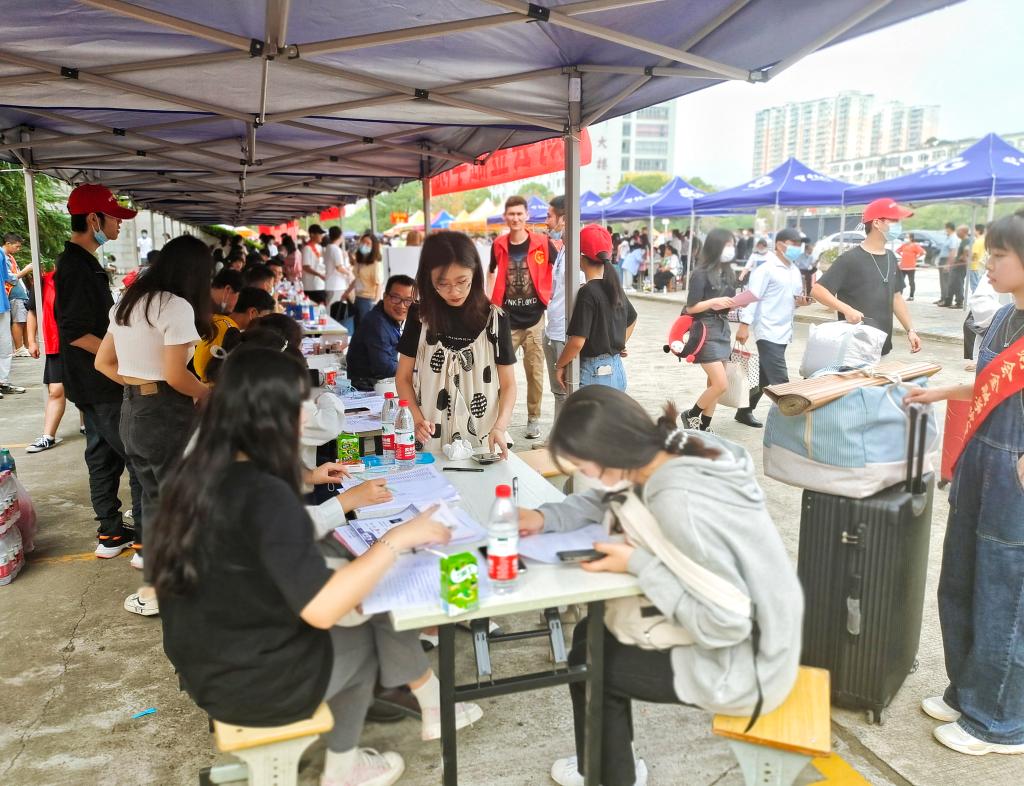 一大早,志愿者们到天使广场集合。大家统一着装,穿着红色夹克,戴着红色帽子,穿梭于人群中。志愿者分成两个小组,第一小组负责校门口迎接,带领新生报到和摆放行李。第二小组负责搬运行李。大家各司其职,迎接了一批又一批的新生。