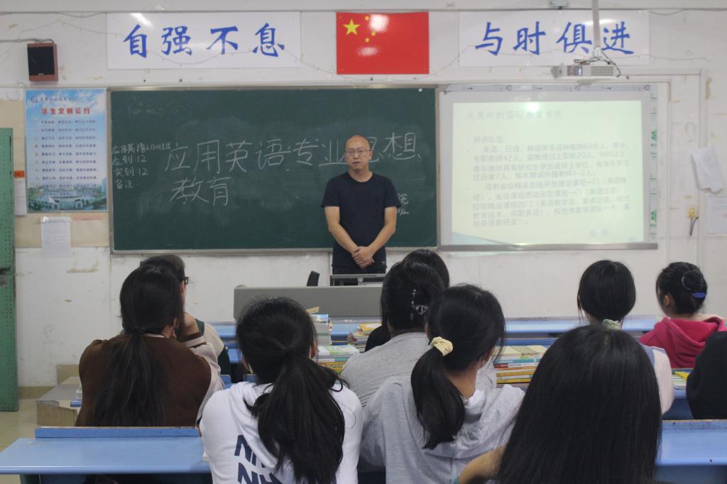 应用英语专业思想教育由肖勇老师主讲。首先肖勇老师对应用英语专业的专业前景、培养目标、培养内容以及毕业生就业方向进行了详细的阐述,然后他就学习应用英语专业的方法进行了传授,并与同学们进行了友好地互动,为同学们答疑解惑。