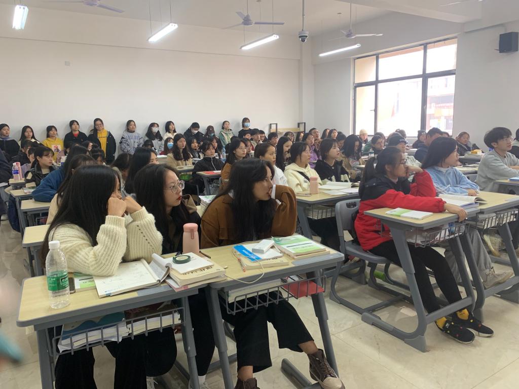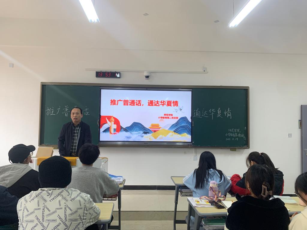 紧接着师范学院党员教师席睿琪同志以一个幽默方言故事为例,引出学习普通话的重要性。从普通话的由来、什么是普通话、为什么要学习普通话、如何学好普通话等四个方面进行了详细的阐述。席老师强调,普通话在少数民族地区的推广与使用不仅能够消除各民族在语言交流中的一些隔阂,还能使少数民族在与其他民族的文化交流中实现更加高效的自我情感表达。推广普及普通话有利于贯彻落实教育面向现代化、面向世界、面向未来的战略方针,有利于弘扬祖国优秀传统文化和爱国主义精神,有利于提高全国各民族的科学文化素质。