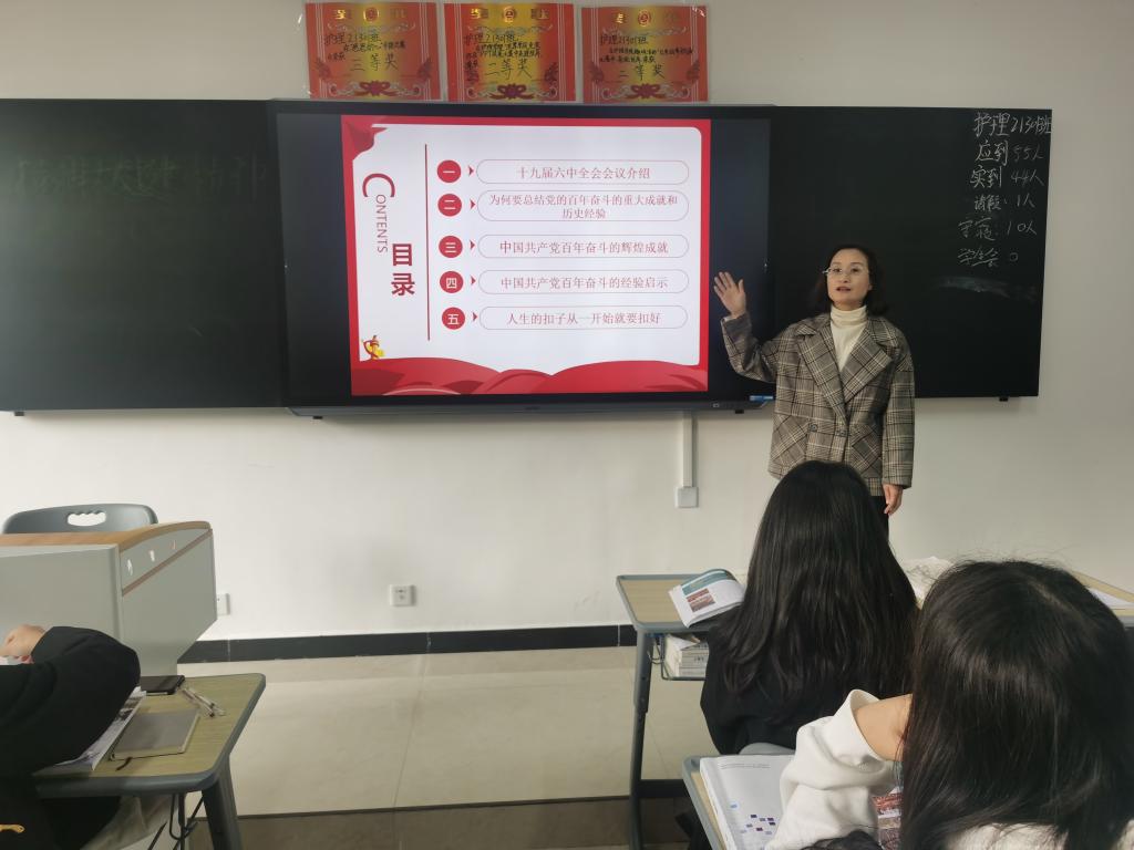 本站讯(护理学院 陈丽红)为进一步深入学习宣传贯彻党的十九届六中全会精神,扎实推进党史学习教育,持续引领广大青年大学生厚植爱党爱国情怀,汲取奋进智慧力量,掀起学习贯彻党的十九届六中全会精神的热潮,把引领青年大学生听党话跟党走持续做深做实。12月5日至8日,护理学院各党支部开展支部联系班级活动,专题宣讲党的十九届六中全会精神。