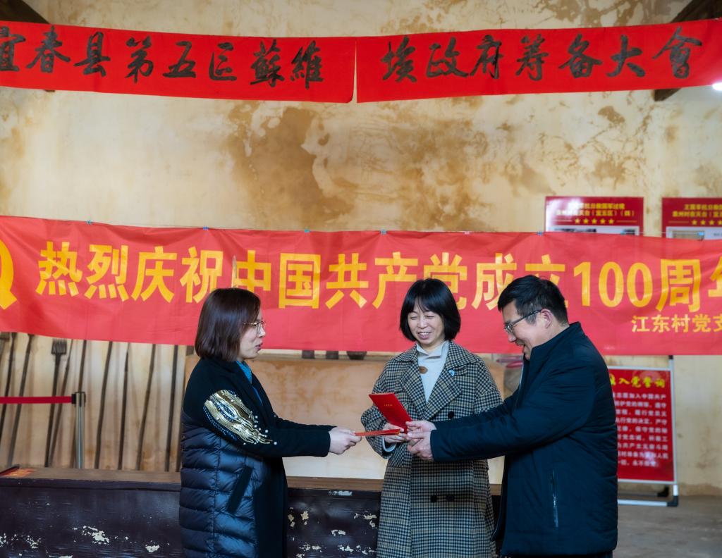在中共宜五区委员会旧址内,支部还为近期过政治生日的党员高健群、邓伟蓉同志送上贺卡,祝愿他们度过一个愉快的政治生日。高健群同志表示,今年是我入党27周年,能在这样一个特殊的地方,和同志们一起度过这个政治生日非常有意义,我将继续牢记共产党员的初心使命,坚定理想信念,践行党的宗旨,无愧于党员这个光荣的身份。邓伟蓉同志谈道,今年是中国共产党成立100周年,我会永远记住自己是一名光荣的共产党员,今后我将继续不忘初心,砥砺前行,为党的教育事业贡献一份自己的力量。