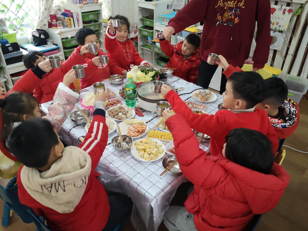 更热闹的是美食制作环节,小班宝贝跟着老师一起制作冰糖葫芦,红红的山楂上裹上一层甜甜的糖,让人垂涎三尺;中班宝贝在老师的指导下包起了饺子,看起来好有范儿啊!大班的哥哥姐姐和老师在教室一起吃美味的火锅,欢声笑语回荡在幼儿园的上空。