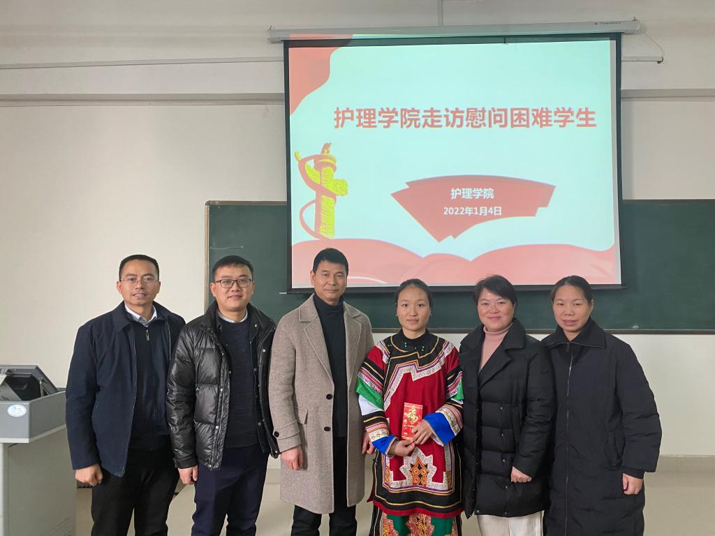 本站讯(护理学院 曲晴)为认真贯彻落实党的十九届六中全会精神,落实国家家庭经济困难学生资助政策,切实关爱家庭经济困难学生,使学子们度过温暖快乐的春节,1月7日下午,护理学院班子成员走访慰问在校少数民族家庭经济困难学生,送上慰问金和慰问品,让学子在寒冬中感受到来自学校的关爱和温暖。