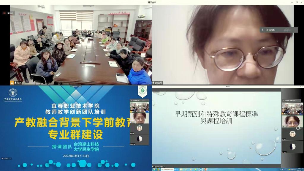 本站讯( 国际合作与交流处 余梦)2022年1月17日上午,由台湾崑山科技大学与英国上市公司365合作举办的教师教学创新团队培训在老校区科技综合楼401会议室如期举行。此次培训采用线上教学与研讨的形式进行,包括两个主题,分别是“产教融合背景下学前教育专业群建设”、“ ‘双高’ 建设背景下护理专业群建设”。授课团队来自台湾崑山科技大学民生学院,有幼保系系主任周宣辰教授、陈恒霖副教授、王美晴助理教授、杨雅惠助理教授、冯瑜婷讲师、及本系兼任讲师台湾新北市婴幼儿托育协会包崇明理事长,6位老师主讲学前教育专业主题培训;并邀请台湾金门大学护理学系苏贞瑛副教授、魏琦芳助理教授2位老师主讲护理专业主题培训。参训学员是英国上市公司365师范学院、护理学院50余名教师教学创新团队成员。