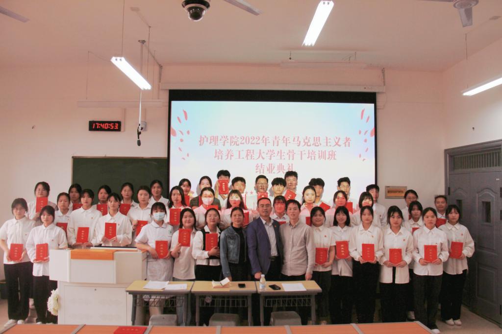 本站讯(护理学院 刘明健 陈佳泠 倪玲帅)为进一步深入贯彻习近平新时代中国特色主义思想,加强对青年的思想政治引领。4月22日下午,护理学院于和济楼C502举办青年马克思主义者培养工程大学生骨干培训班结业典礼。结业典礼由护理学院团总支负责人、青马班班主任刘小三主持,党总支副书记张蔺珊、辅导员刘明健及全体青马班学员参加。