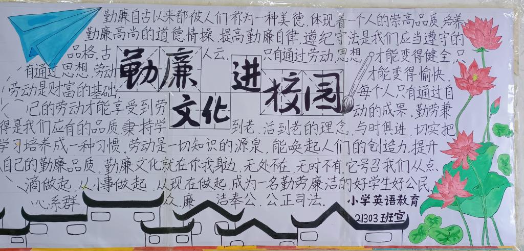 本站讯(国际教育学院 汪樱)为进一步推动学校勤廉文化建设,积极营造“学党史、讲勤廉、守初心”的校园风尚,按国际教育学院“勤廉文化进校园”实施方案安排,我院各班于5月27日中午在教室开展了以“勤廉文化进校园”为主题的室内板报评比活动。