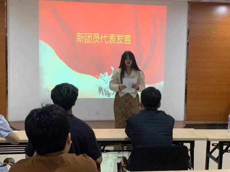 伴随着歌声的响起,全体成员起立一起奏唱国歌,主持人宣布新团员名单:舒紫娟、蒋建宇、揭开阳、付晨曦、张堂力,并特此强调团员意味着责任。青年兴则国家兴,青年强则国家强,中国的新青年在共青团的带领下持续成长,持续进步。随后,给新团员佩戴团徽,发放团员证、团章,并由院学生会执行主席周景荣带领新团员宣誓;入团介绍人康鹏代表宣读《团员的义务和权利》。