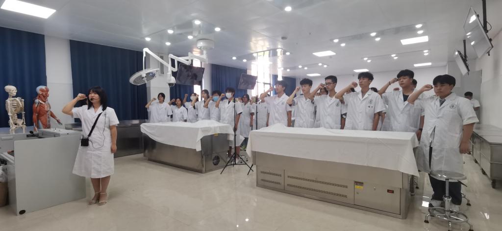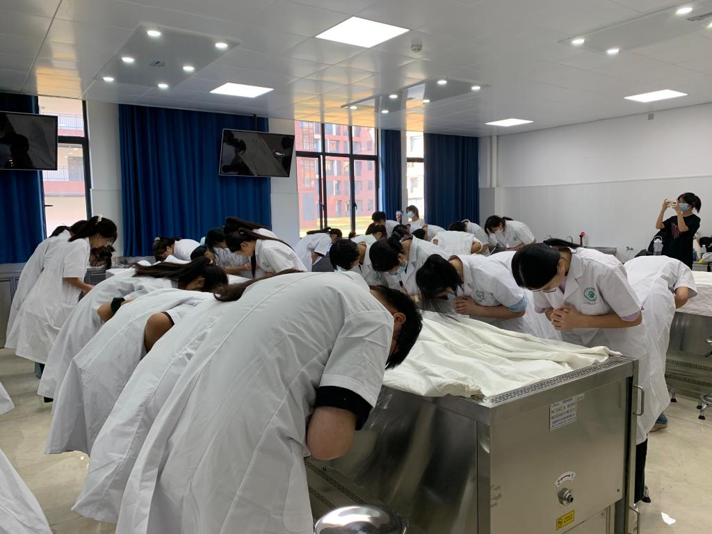 “大体老师”是医学生的“无语良师”,也是医学生感知生命的领路人,用自己的躯体为学生架起通往医学殿堂的桥梁。《人体解剖学》开学第一课以“秉承生命至上,感恩无语良师”为主题,旨在通过给同学们讲述大体老师感人的生平事迹、“宁愿医学生在我身上划上千刀万刀,也不愿在患者身上划错一刀”的伟大心愿以及为国家培养医学人才而捐献自己宝贵遗体的大爱精神,弘扬大体老师的高尚品德,向无语良师鞠躬致敬,完成和强化了“我是未来的白衣战士,肩负着救死扶伤的社会担当”的身份认同,号召准白衣战士们不忘献身医学初心,牢记救死扶伤使命,树立生命至上、尊重生命、敬畏生命的职业信念,活动在医学生誓言的铿锵宣誓中圆满结束。