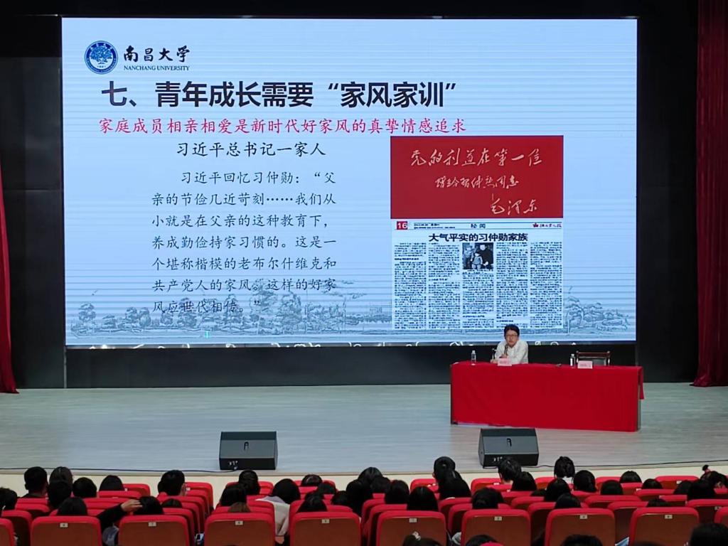 胡邦宁首先从《乔家儿女》《人世间》等几部热映电视剧的情节引入,引发大家对家风家训的思考。然后通过讲经历、讲故事、讲历史,带领在场听众充分了解家风与家训的内在关系,引导青年学生学习好、传承好中华优良家风家训。最后,胡邦宁以习近平总书记的优良家风事迹勉励青年学生要谨遵良好家风家训,深刻理解新时代“好家风”的科学内涵。