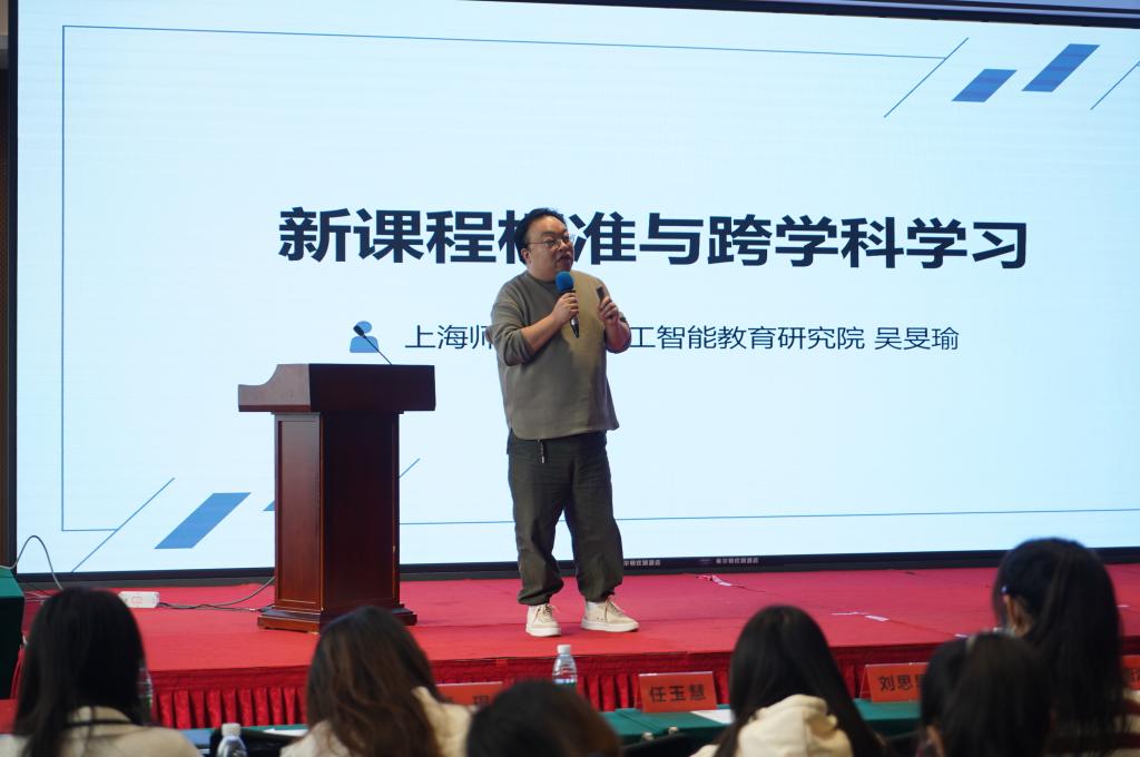 来自上海师范大学的吴旻瑜教授用诙谐幽默的语言给同学们讲授了新课程标准与跨学科学习相关知识。他指出,未来的教育离不开新课程标准,多少真知灼见背后展现出教育者的创新思维,跨学科学习并非一门学科,而是一种解决问题的方法。