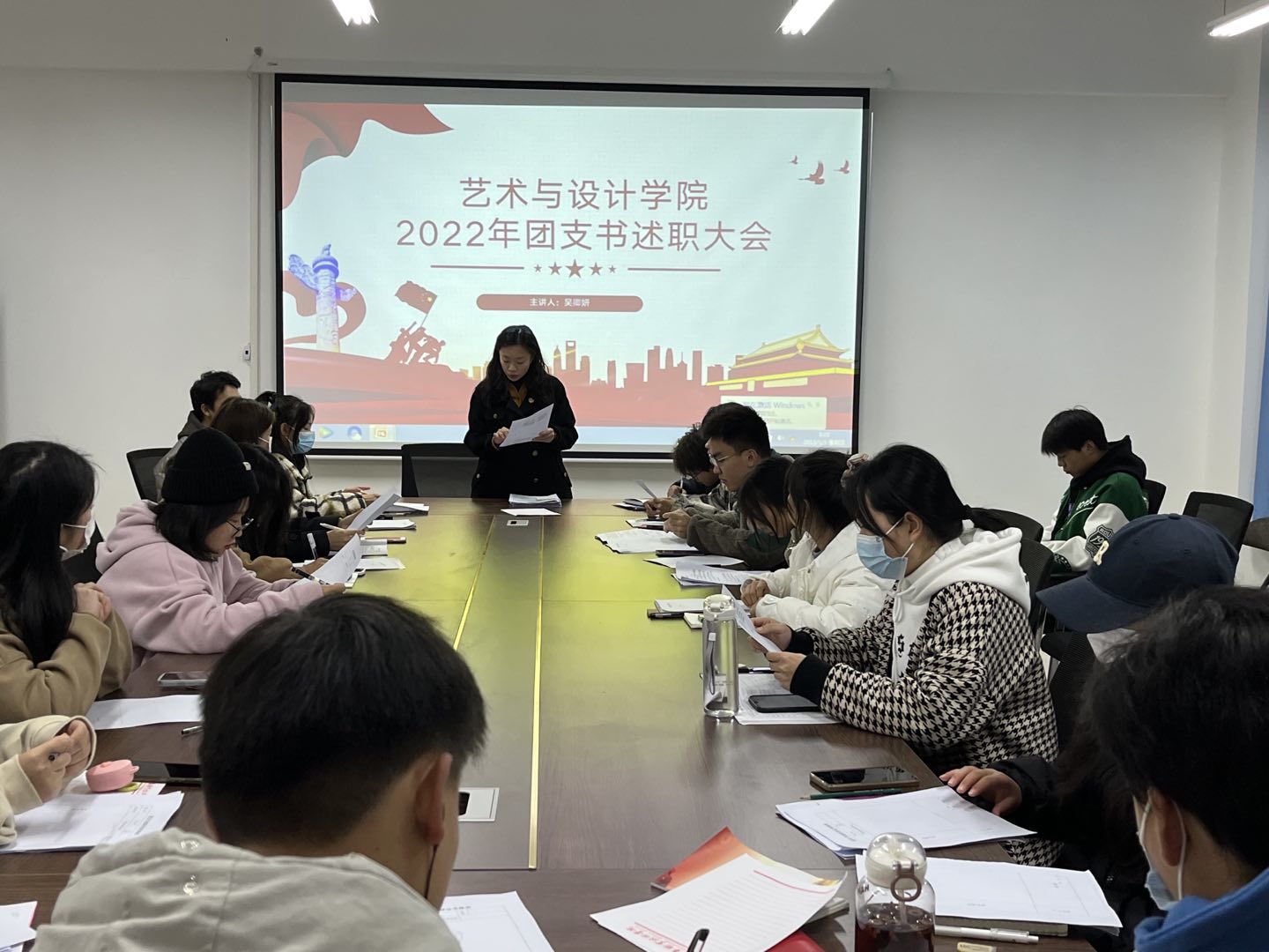 各团支书全程佩戴口罩参与述职大会。各团支书围绕基层团支部简况、组织建设、人员架构、开展主题团日活动情况、班级同学入团情况、团支部志愿服务情况、党史学习情况进行了简要介绍,对自己在任职期间的工作做出总结,并相互交流学习工作经验。重点讲解了“对标定级”参考标准——班子建设、团员管理、组织生活、制度落实、作用发挥,为团支部“对标定级”奠定基础。最后团支书们反思本学期工作的不足,并纷纷表示在今后的工作中要努力提升自我价值,积极号召支部成员开拓进取、坚定信念跟党走,做新时代的优秀青年。