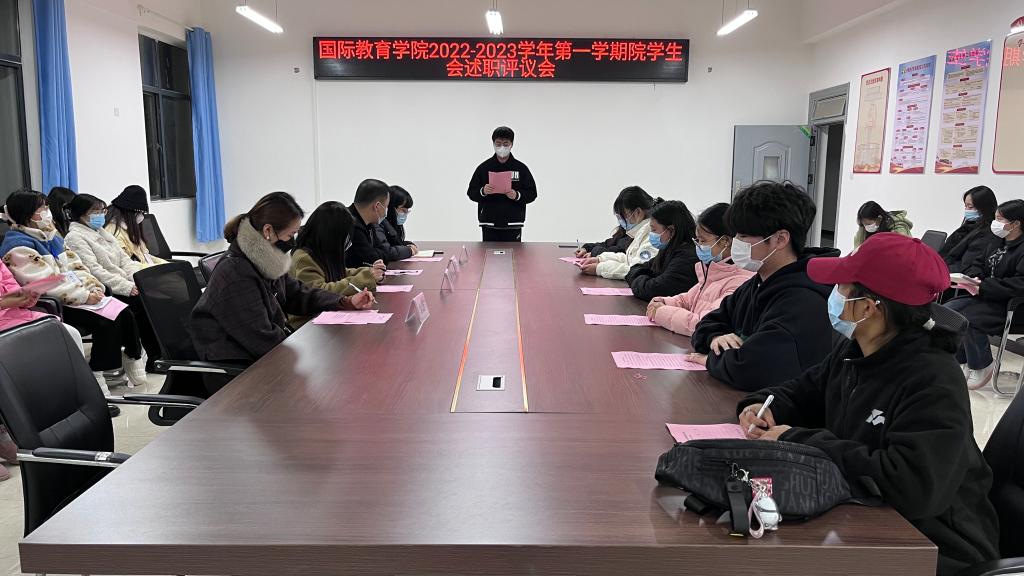 本站讯(国际教育学院 杨琨 学生记者 肖丽平)为扎实推进学生会组织深化改革,进一步加强学生组织队伍建设,推动学生会工作高效率开展,12月12日晚,国际教育学院在博达楼B座502会议室开展了2022-2023学年第一学期学生会述职评议会。学院党总支书记刘海云、副院长杜欣宇、全体学工人员、学生会及各班代表出席会议。会议由院团总支书记杨琨主持。