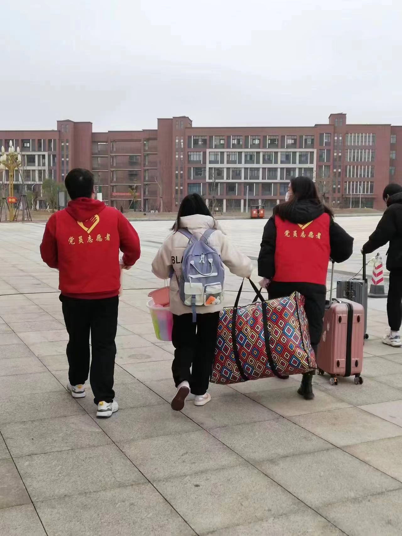 校门口,来自机关第六党支部的党员教师和党建育人工作站的学生党员,身穿红色马甲穿梭于学生之间,对校门口交通秩序进行维护。他们无数次往返于校园内外帮学生搬运行李到摆渡车上,有的直接送进宿舍。这抹“志愿红”高效热情的服务,让刚离家返校的学生直呼暖心,在寒意浓浓、细雨绵绵的早春季节倍感温暖。