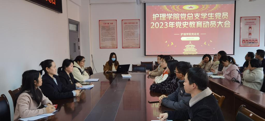 本站讯(护理学院 刘小三)为深入学习习近平新时代中国特色社会主义思想,进一步增强“四个意识”、坚定“四个自信”、做到“两个维护”,培养坚定的马克思主义者,2月21日,护理学院党总支在和济楼党员活动室召开学生党员2023年党史教育动员大会。会议由党总支副书记曲晴主持。