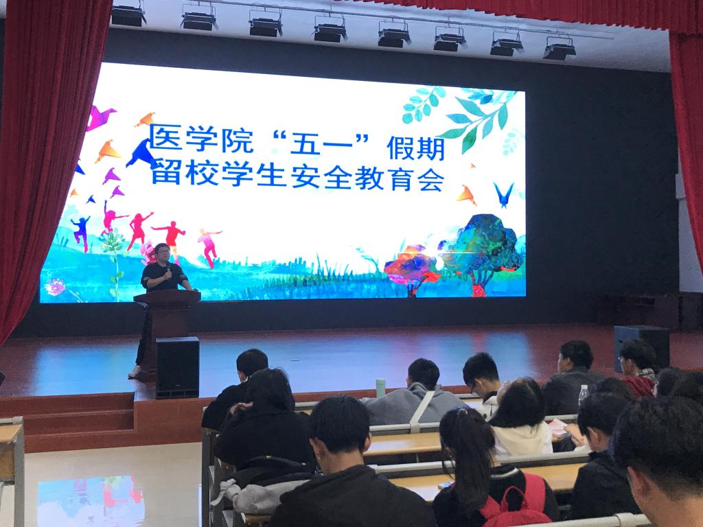 本站讯(医学院 刘倩)为做好“五一”假期期间的安全稳定工作,提高学生的安全意识和避险能力,确保留校学生度过一个安全和有意义的“五一”假期,4月28日中午,医学院在仁济楼小礼堂召开“五一”假期留校学生安全教育会,医学院320名留校学生参会,会议由医学院学工科科长李灿主持。