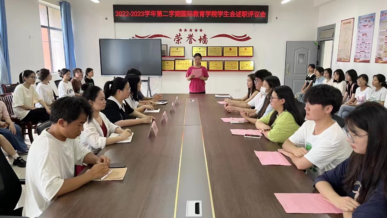 本站讯(国际教育学院 杨琨 学生记者 杨羽心)为进一步加强学生组织队伍建设,推动学生会工作高效率高质量开展,展现自信自强、刚健有为的精神风貌,6月20日中午,国际教育学院在博达楼B座502会议室开展2022-2023学年第二学期学生会述职评议会。院长王玮,全体学工人员、学生会成员及各班代表参加会议。会议由团总支书记杨琨主持。