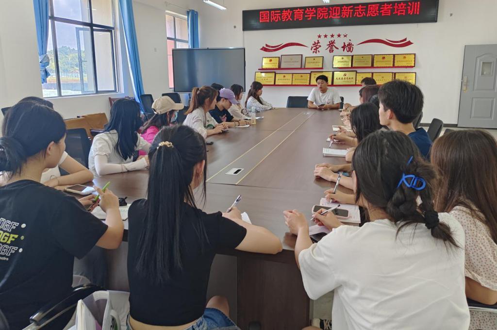 本站讯(国际教育学院 赖培鑫 汪彦妤)为全面做好迎新工作,提高志愿者的服务能力,确保迎新工作高效有序运行,9月8日,国际教育学院2023级迎新志愿者培训会于博达楼B座五楼党员活动室顺利展开,学院辅导员赖培鑫及20余名迎新志愿者参加培训会。