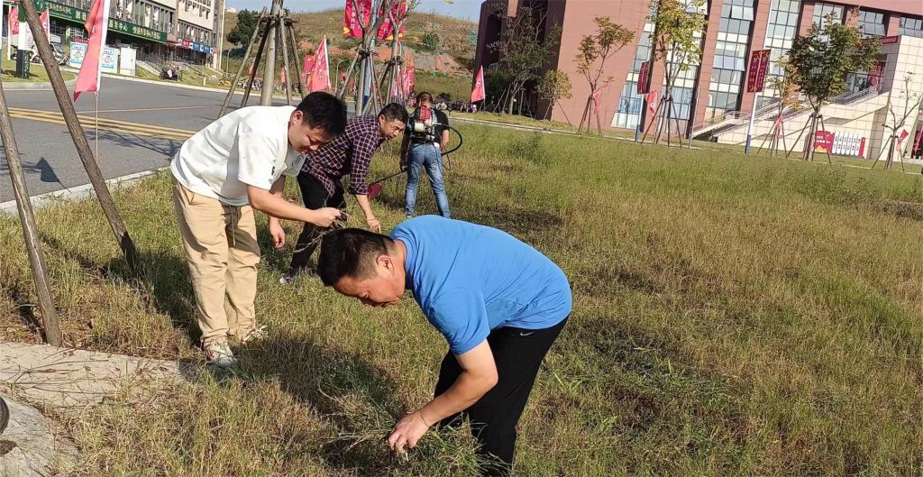 党员干部从自家带来割草机除杂草、捡拾垃圾。大家顶着烈日,认真落实学校的环境卫生综合整治工作,努力为师生创造洁净的校园学习环境。
