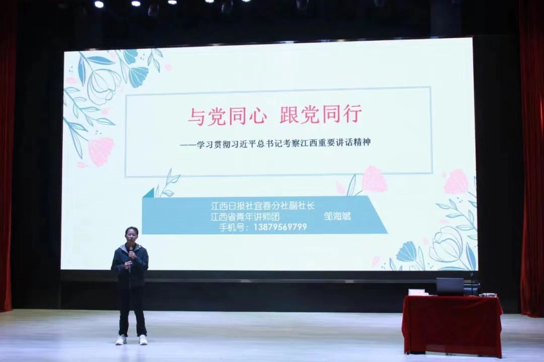 10日晚,江西日报社宜春分社记者、省青年讲师团成员邹海斌老师从“扬优势、固基本、闯新路”三个层面引导学子深入学习习近平总书记考察江西提出的“解放思想、开拓进取、扬长补短、固本兴新”16字要求,并从全力打造“三大高地”、实施“五大战略”、咬定“一个目标”、发力“五个突破”、聚力“八大攻坚”五个角度号召宜职青年抢抓机遇成长成才,发挥优势均衡发展,牢记嘱托,砥砺前行,奋力谱写中国式现代化江西篇章。