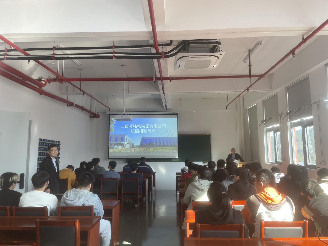 本站讯(机电与新能源汽车学院 彭卫发)为进一步做好实习生就业工作,抢抓毕业生就业黄金期,引导学院2024届毕业生高质量就业,11月21日,机电与新能源汽车学院邀请江西苏强格液压有限公司在新能源技术工程中心601教室开展专场招聘宣讲会。