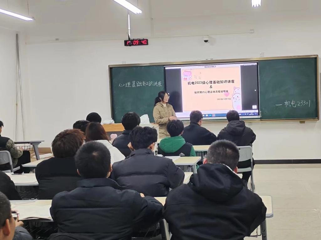 本站讯(机电与新能源汽车学院 欧阳健林)为让学生掌握心理基础知识,在困惑、迷茫等特殊时刻能够及时得到心理咨询的帮助,12月10日晚,机电与新能源汽车学院针对2023级各班同学举办心理基础知识讲座暨如何预约心理咨询流程说明会。