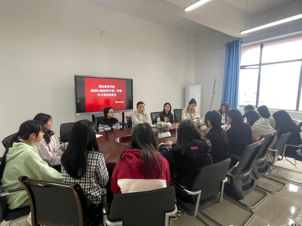 本站讯(国际教育学院 颜灵仪)为更好开展本学期教学工作,提高教学质量,4月8日,国际教育学院在博达楼B501室召开学习委员座谈会。副院长杜欣宇主持会议,教务科长张源晴,干事颜灵仪以及相关教研室主任参加会议。