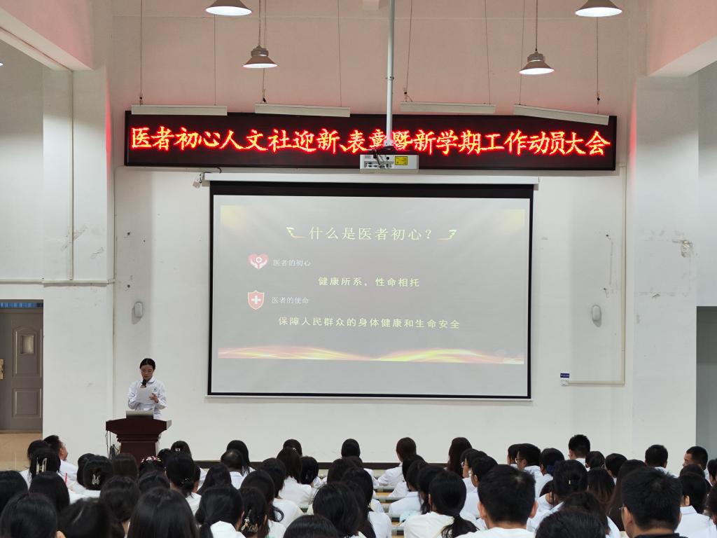 本站讯(医学基础部 尹史帝)为深化基础医学课程教学改革,夯实党支部建设,推动学生社团健康发展,布置新学期教学工作,9月24日,医学基础部在和济楼一楼报告厅举行医者初心人文社迎新、表彰暨新学期工作动员大会,参加大会的有党支部全体党员、医学形态教研室全体教师、人文社团新老成员和2024级基础医学课程学生助教。