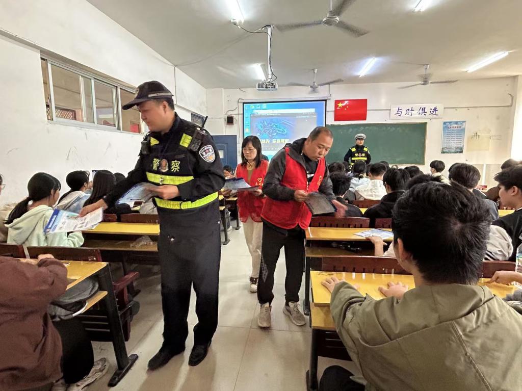 活动伊始,党员和交警给学生发放交通安全宣传单,交警城南支队易队长做安全教育讲座并指导师生一起观看交通安全视频,倡导师生要加强交通安全知识的学习,提升交通安全意识,养成良好的出行习惯。