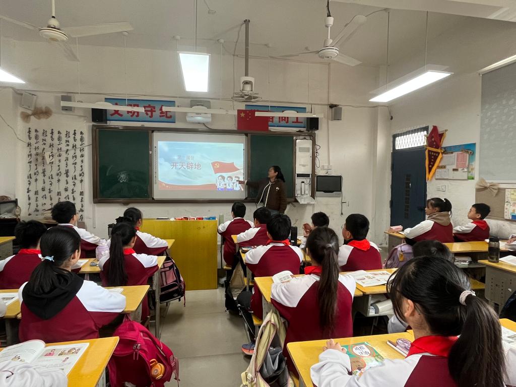 课堂上,党支部书记柳琴从“开天辟地”“改天换地”“翻天覆地”“惊天动地”四个方面,将党的百年奋斗征程娓娓道来:从建党建国时的艰难探索,到开拓创新的改革开放,再到惊天动地的现代强国,一段段波澜壮阔的党史震撼着孩子们的心灵。