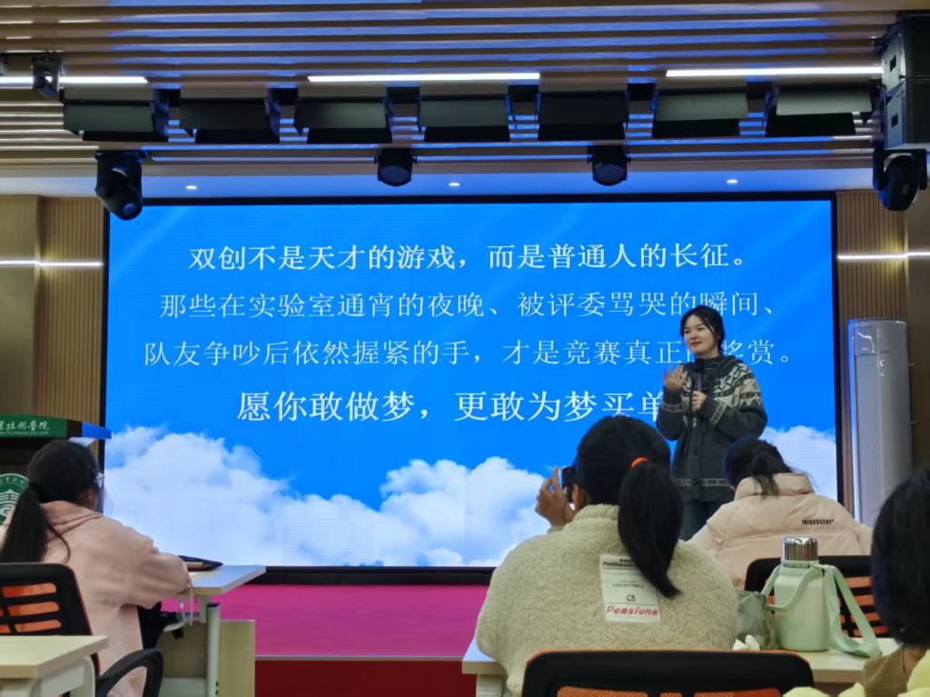 分享会上,她结合在校期间三年磨砺的“1000昼夜方法论”,为学弟学妹们总结凝练项目培育的三项原则:一是主动深挖需求,以符合国家“以需求为导向”的创新政策,建立项目孵化的敏感度;二是联动导师资源,体现立德树人、协同育人的教育理念,构建师生共创的生态圈;三是融入成熟团队,积累实战经验值,展现在实践中成长、在团队中成才的青年发展路径。她强调“优秀项目不是等来的,需要主动出击构建创新网络,这是国家倡导的创新精神,也是青年人应有的担当;双创不是天才游戏,而是普通人用坚持丈量的长征路。”短短1个半小时的分享,谭康馨用实战智慧为学弟学妹们绘制了一幅双创成长地图。
