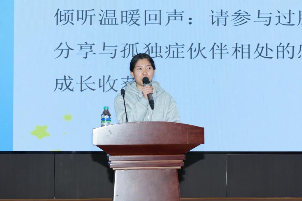 张俊蓉深入浅出地介绍孤独症的基本知识,让同学们对孤独症群体有了更全面、科学的了解。接着,通过电影《小小的我》展现出孤独症患者的生活困境,强调关注孤独症群体的必要性。她指出,尊重孤独症患者是践行社会主义核心价值观的体现。同时,她呼吁同学们应通过日常友善互动、校园倡导和志愿服务等方式给予孤独症群体帮助。随后,两位志愿者上台分享了他们与孤独症伙伴相处的感动瞬间,激励着同学们用实际行动为社会贡献力量。最后,全体同学合唱歌曲《追光者》,点点星光在手中亮起,用歌声传递爱与希望。
